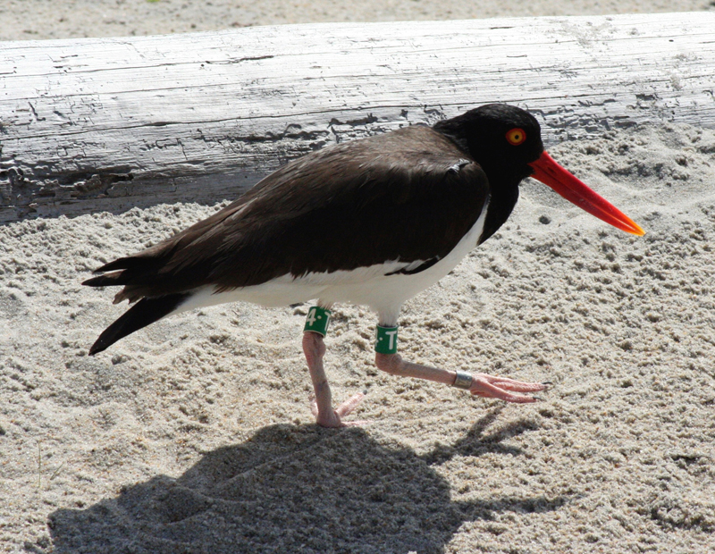 American OystercatcherThe American oystercatcher is a large shorebird. It is 17-21 inches in length. It has long pink legs and a long, bright reddish-orange bill. It has black feathers on top and white feathers on its underside and rump. It has a large white stripe on its wings that is visible when it is in flight. Its eyes are yellow with an orange ring around them. Males and females look alike.