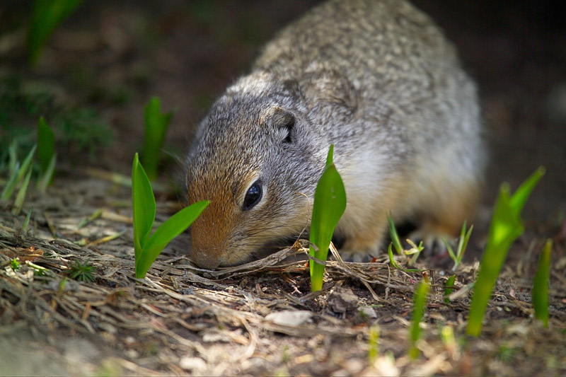 The majority of the Columbian ground squirrel's diet is made up of grasses and plant parts like stems, leaves, bulbs, fruits and seeds. Occasionally it will eat birds, insects and other small animals. |