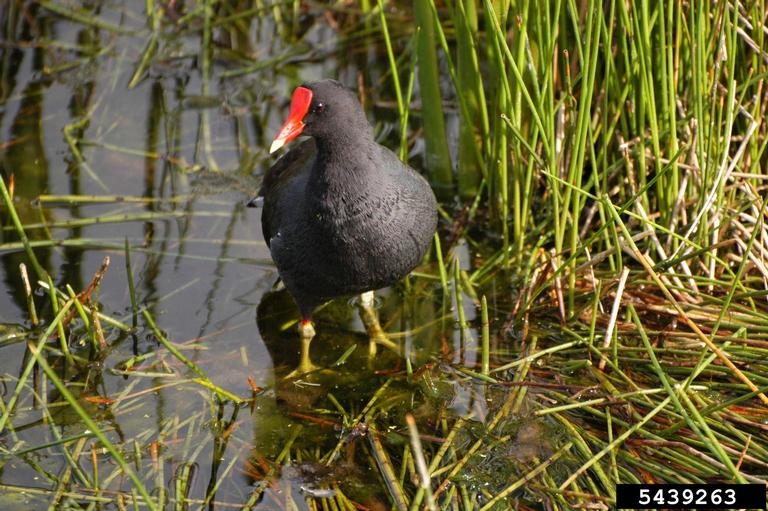 The common moorhen is a meduim-sized member of the rail family found in aquatic environments. It is 12-15 inches in length and has a wingspan of a little under two feet. It has gray-black feathers and a red bill with a yellow tip. It has white stripes on its sides. It has long chicken-like toes that help it walk on the top of floating vegetation and the mud. Males and females are similar, but males are a little larger.