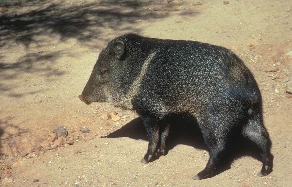 Collared PeccaryThe collared peccary has a pig-like snout, a large head and shoulders and small legs with hoofed feet. It has grizzled gray and brown bristly fur. It has a collar of white or yellowish fur around its neck and small, straight tusks. It is two to three feet long and stands about one and a half feet to two feet tall. It has a musk gland at the top of its rump. It uses its musk to identify members of its group and to mark its territory. It is sometimes called the javelina.