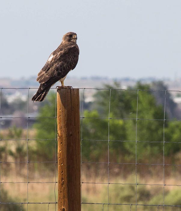 Swainson's hawk lives on open plains, prairies, agricultural areas, and other grasslands. It is often seen perched on poles and fence posts looking for prey.