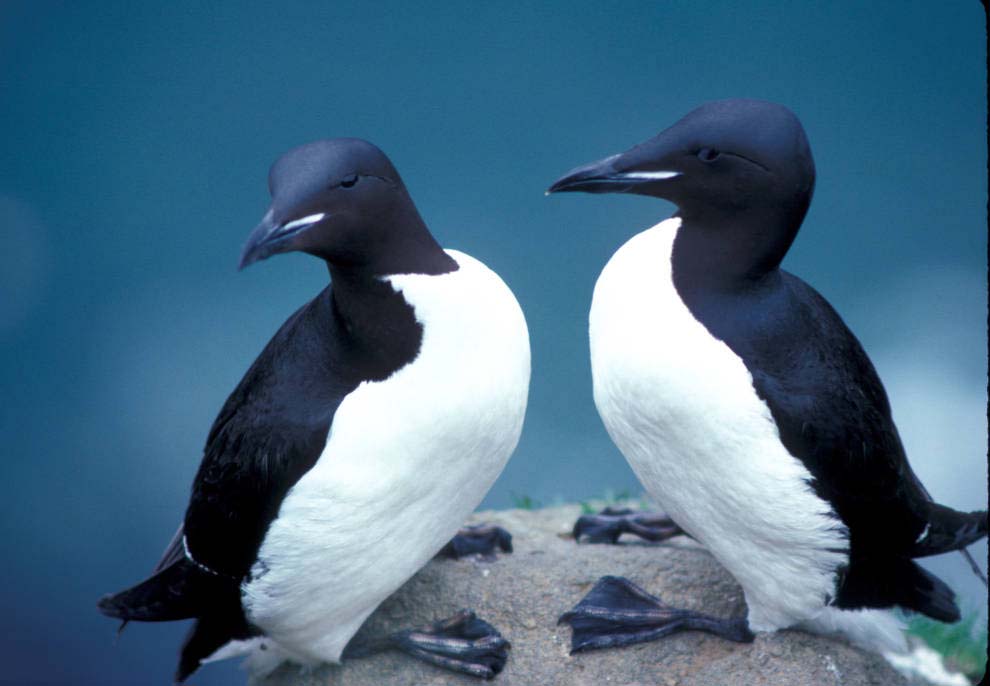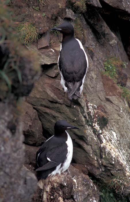 The female thick-billed murre lays a single large bluish-green egg on a narrow ledge.