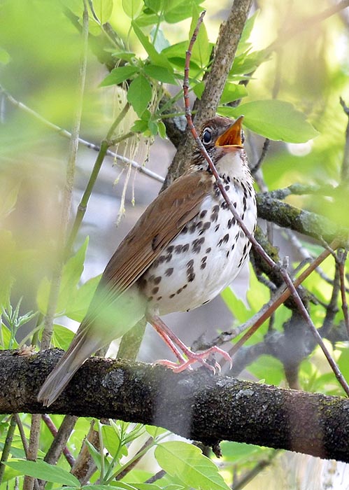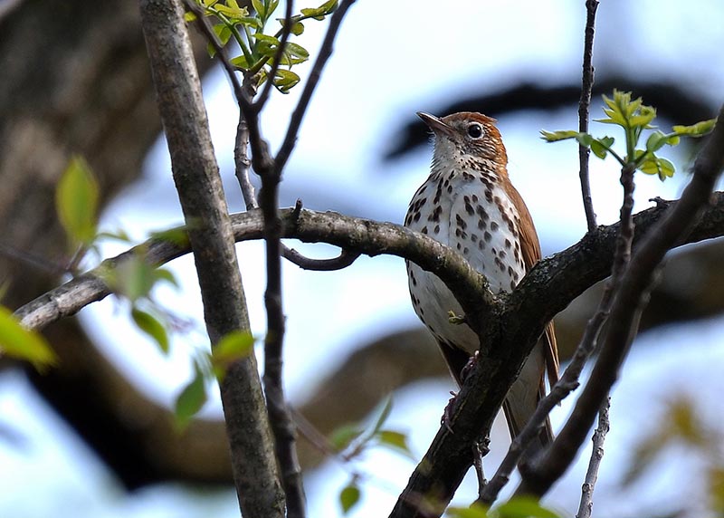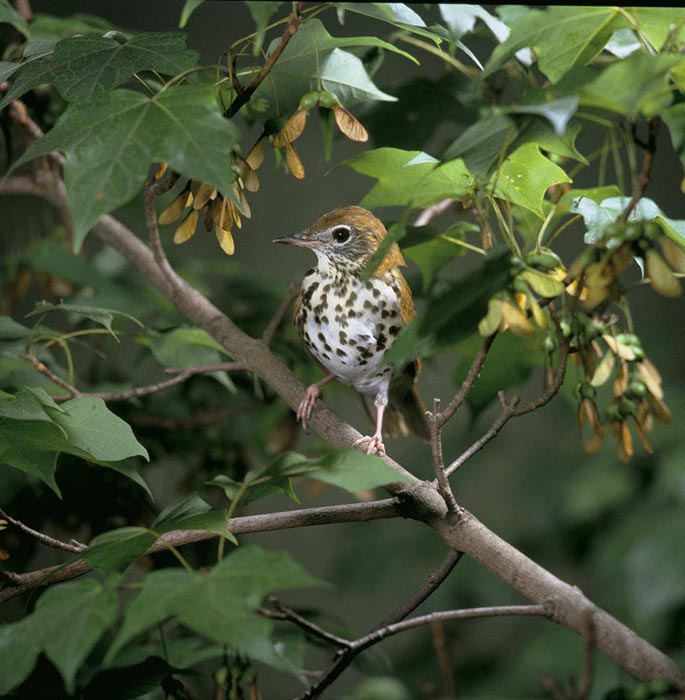 Wood ThrushThe wood thrush's head, back and wings are brick red in color. It has a white belly speckled with dark spots.  Its red coloring helps it stay camouflaged in the leaf litter while it hunts for insects on the forest floor. The male sings a clear, ee-oh-lay that is easily heard throughout its forest home in the spring and early summer.