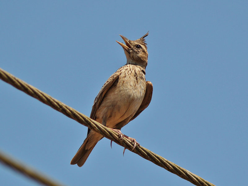 The Eurasian Skylark has a small crest or feathers on its head that it raises when it is excited.