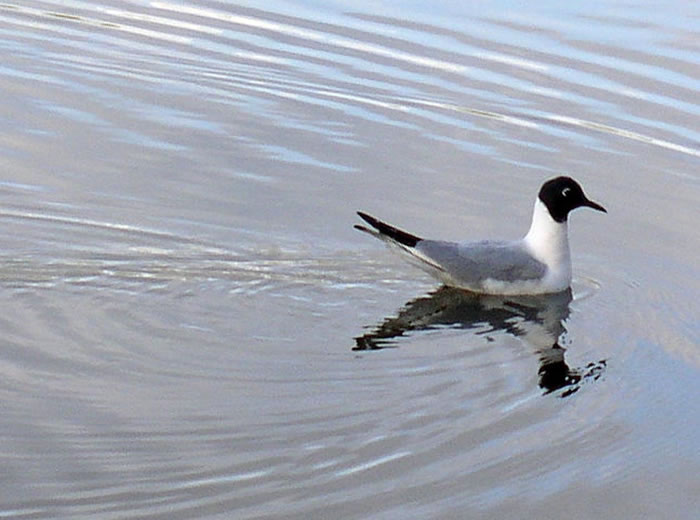 bonapartes gullBonaparte's gull is a small gull that is 11-15 inches in length with a wingspan of 30-31 inches. It has white undersides and breast, slate gray upperwings and back, and black tips on its wings. It has a black bill, reddish-orange legs and feet, and an orange lining on its mouth. During breeding season, it has a black face and head with white crescents above and below its eyes. In winter, its head and face are white. Males and females look alike.
