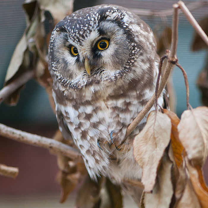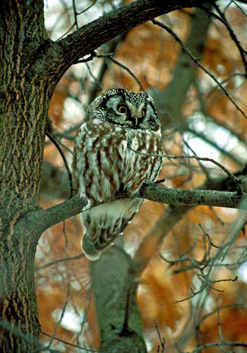 Boreal OwlThe Boreal Owl is carnivorous and feeds on small mammals like voles, mice, chipmunks and squirrels. It also eats insects and small birds, such as the American Robin. Hunting from a protected perch, the Boreal Owl swoops down and grabs its prey with its long talons. During winter and breeding season, the Boreal Owl caches, or saves, its food in its nest or a crook of a tree.