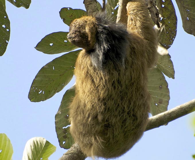 The maned three-toed sloth is named after its long mane of black hair, which runs down the back of the neck and over the shoulders.