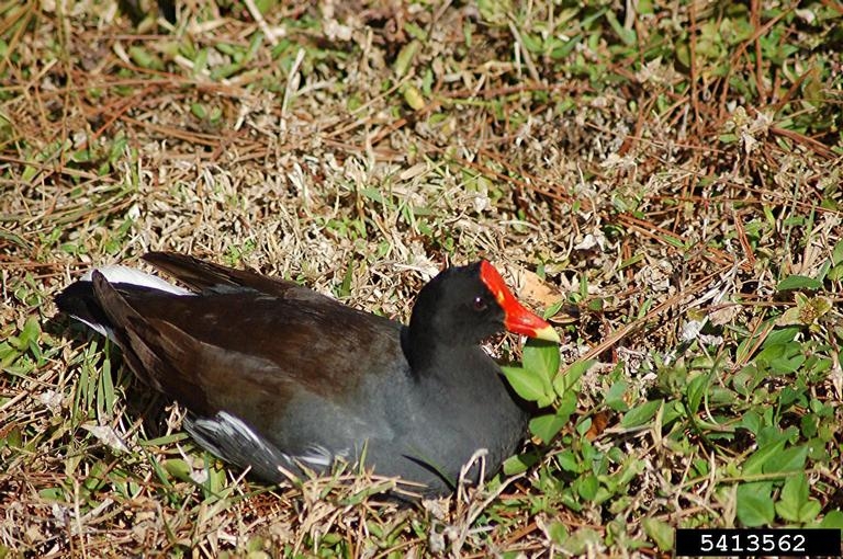 The common moorhen is a medium-sized member of the rail family found in aquatic environments. It is 12-15 inches in length and has a wingspan of a little under two feet.