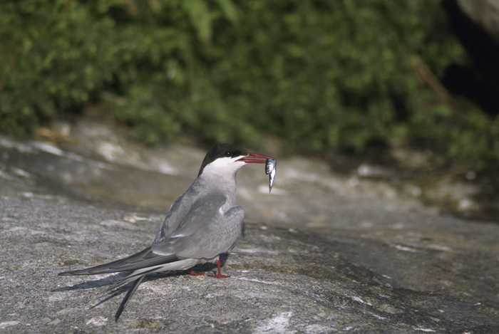 Common TernThe common tern eats small fish. It flies over the water and then plunges below the surface to snatch up its prey. It occasionally eats crustaceans and insects.