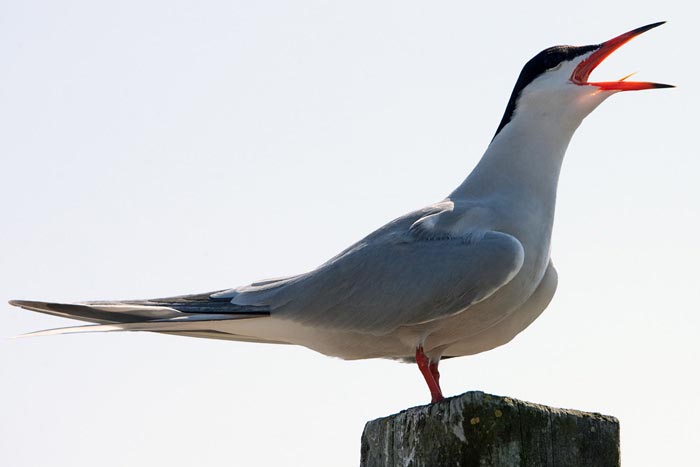Common TernThe common tern is 12-15 inches in length with a wingspan of 30-31 inches. It has a white breast and undersides and a slate gray back and upperwings. It has a black cap on its head and orange-red legs and feet. It has a pointed, bright orange bill with a black tip and a forked tail. Males and females look alike.
