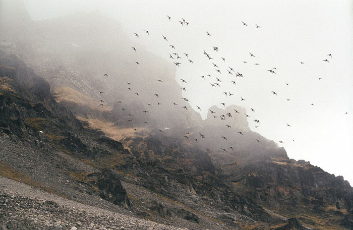 DovekieIn the summer, thousands of dovekies gather at nesting sites alongside the ocean. Nests are made of pebbles, with a depression in the center for the egg to be laid. The male defends the nest. The female lays one egg per year, which she incubates for about a month. Chicks fledge after 28 days, leaving the nest by themselves or in small groups.