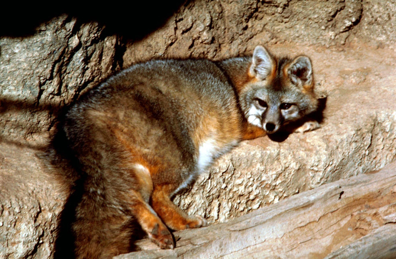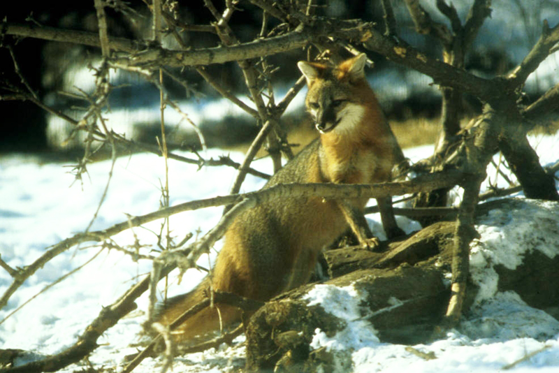 Gray FoxThe gray fox can climb. It occasionally climbs a tree to forage for food or to rest. It makes its den in rocky crevices, caves, hollow logs, and trees. It sometimes enlarges a woodchuck burrow and uses it as a den. Dens are usually used only during the mating season and when raising young.