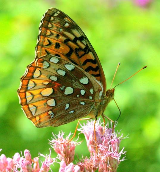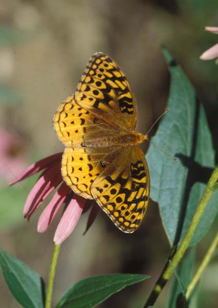 The great spangled fritillary is found in open, moist places including fields, pine and oak woods, conifer forest openings, and meadows.