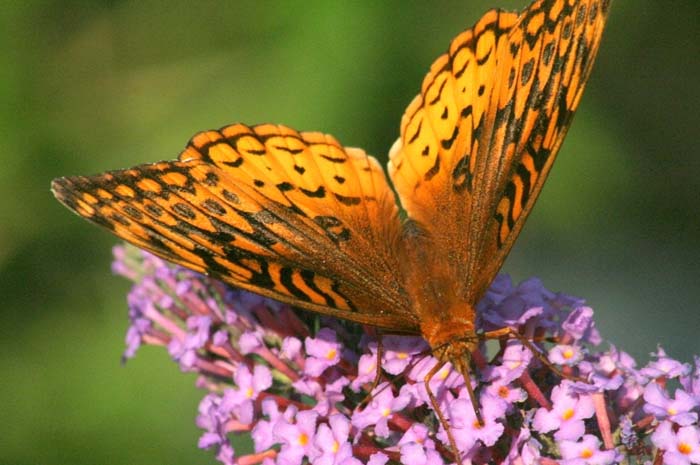 great spangled fritillaryThe great spangled fritillary mates in June or July. The female lays her pale brown eggs on or near violets in August and September. The caterpillars are black with orange-tipped spines. They overwinter until spring, when they eat young violet leaves.