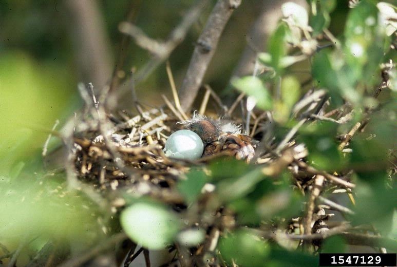 The nest is built in a tree, in a dense thicket, or occasionally, in the reeds or cattails in a marsh or in an orchard. The eggs take about three weeks to hatch and both parents incubate the eggs. The chicks are fed regurgitated food by both parents. When a parent comes to the nest, the chicks grab its bill to stimulate regurgitation. The chicks fledge in about three weeks but are hopping around the nest and snapping at insects when they are two weeks old.