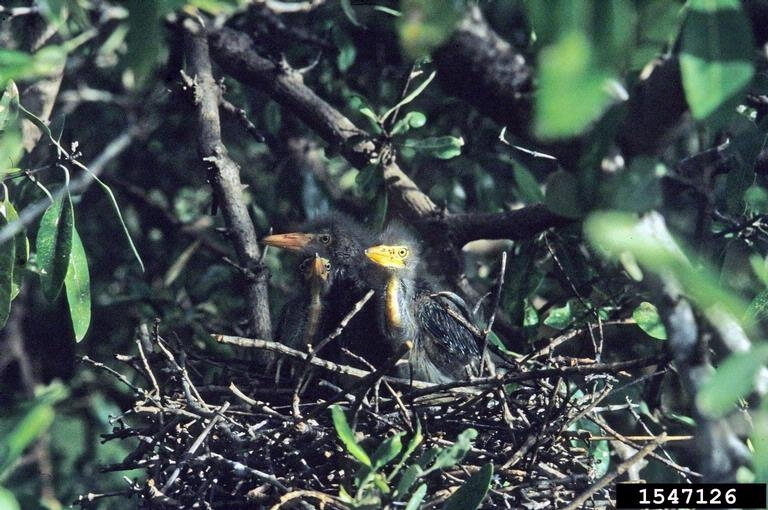 Life Cycle The female green heron lays three to six eggs in a nest made of sticks. Both the female and male make the nest. The male gathers the materials and the female constructs the nest.