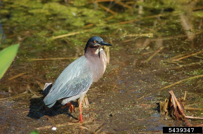 The green heron has a dark head with a small black crest. Its back and wings are dark gray-green to dark gray-blue. Its neck is rust colored. It has a dark bill and its legs are orange or yellow.