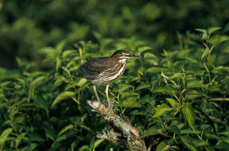 The green heron feeds at the edge of the water. It eats mostly small fish, but it also eats crustaceans, mollusks, insects, reptiles, amphibians, spiders, and leeches.