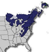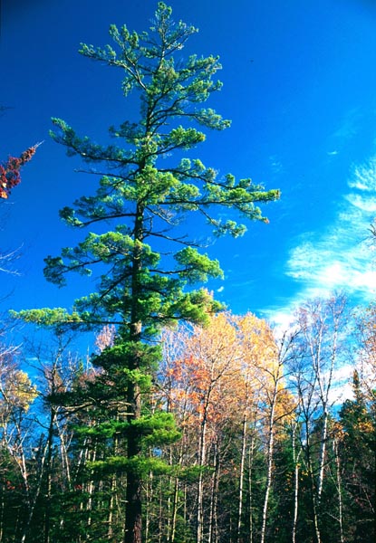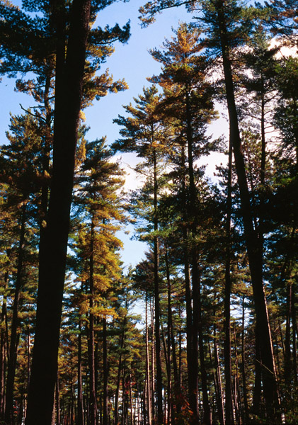 White PineThe white pine is the largest conifer in the Northeast. It has a straight trunk with a crown of horizontal branches. It can grow to be 100 feet tall and its trunk can have a diameter of 3-4 feet. It has slender, greenish-blue needles that are 2.5-5 inches long that grow in bundles of five. It has long, narrow yellowish-brown cones 6-8 inches long. The bark of the white pine is smooth and gray when the tree is young. It becomes gray-brown and deeply furrowed as the tree ages. The white pine can live to be 400 years old.