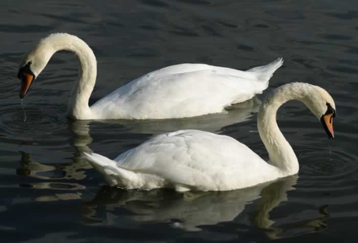 Mute SwanThe mute swan is 50-60 inches in length with a wingspan of about 82-94 inches. It is completely white and has a long, graceful neck; an orange bill with a black knob at the base; a black face; and black feet and legs. It has a pointed tail and lacy wing feathers. Males and females look alike, but the male is usually a little larger, and the black knob at the base of his bill is larger.