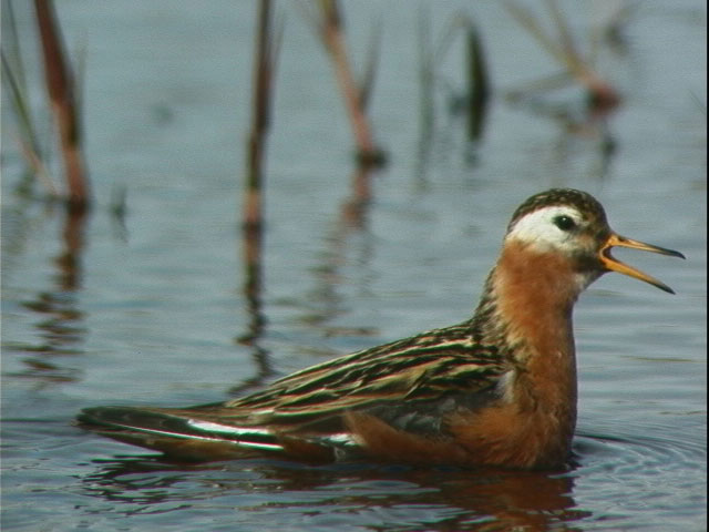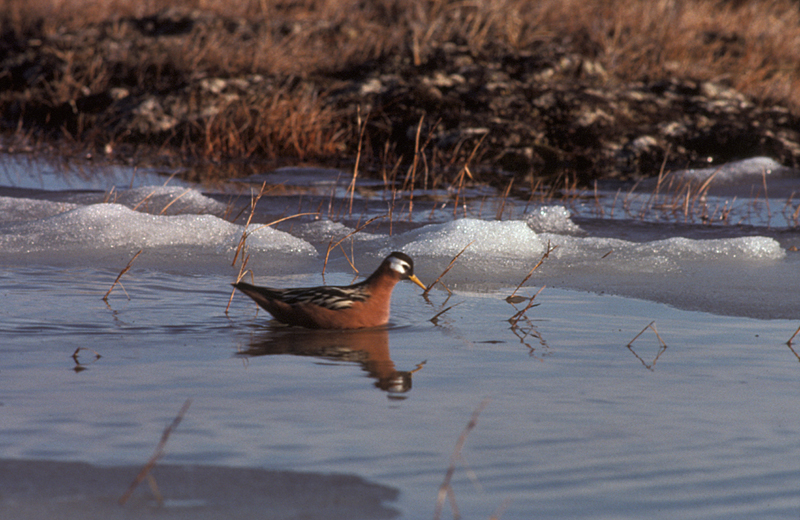 Red PhalaropeThe red phalarope breeds on the tundra. In the winter, it is found on the open ocean off the coast of South America.