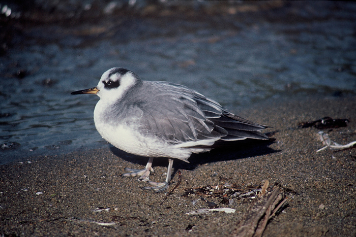 Red PhalaropeDuring the winter, the red phalarope is a light gray on its back and wings and white on its breast and belly. It has a white head with a black patch across its eyes.