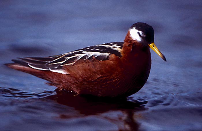 Red PhalaropeThe red phalarope is a medium-sized shorebird that spends most of its time at sea. It is 8 inches in length with a 14-15 inch wingspan. It has a white stripe across its wings that is visible when it is in flight. It has a dark rump and and a dark stripe down its tail. During breeding season, the female has a reddish-brown neck, breast, and belly; a brown and black mottled back; a black head; a yellow bill; and white cheeks. The male is a little duller in color and has a brown cap.