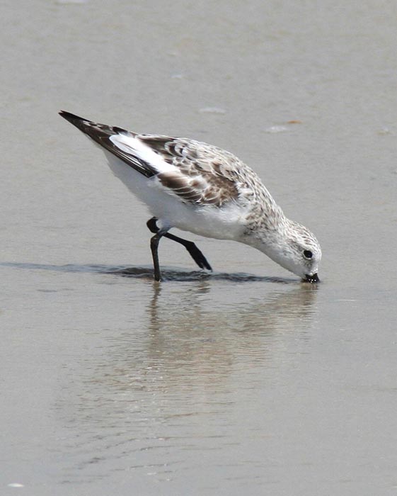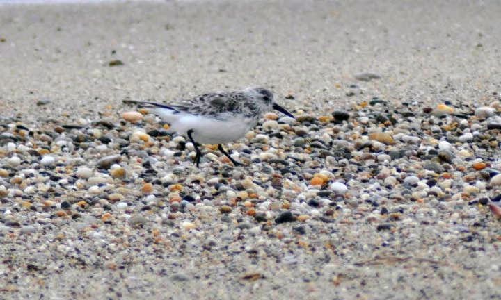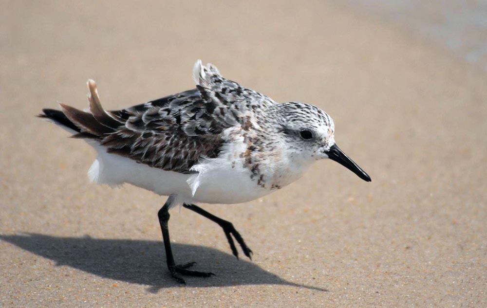 The sanderling is a medium-sized shore bird that is about 6 inches in length. It is speckled brownish-gray on its uppersides and has a dark, pointed bill; black legs; and a white belly. In winter, the sanderling's plumage turns grayish-white.