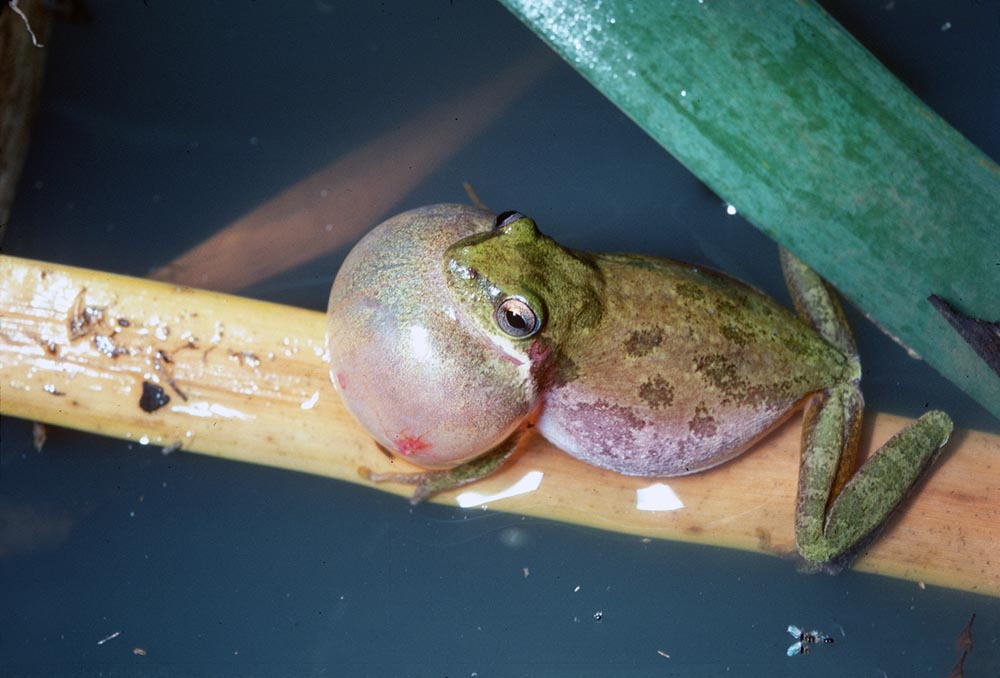 The squirrel treefrog can vary in color from brown to yellow-green to green. It is 1-1½ inches in length. It may have a light stripe running from under its eye along its jaw. It may also have a dark mark between its eyes, and it may have dark spots on its body. It has large toe pads that help it cling to trees. The squirrel treefrog gets its names from its squirrel-like call.